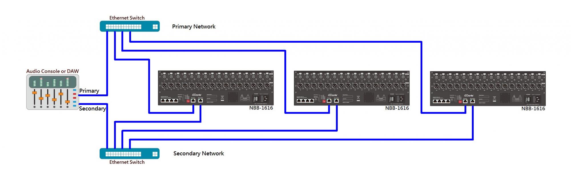 將所有的NBB-1616設定在備援模式下,你可以將你的音訊透過二個幾乎是完全獨立的網路同時送到NBB-1616,大大地增加容錯能力。