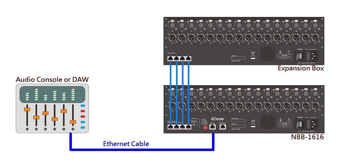 NBB-1616可以與支援Dante的音控台連線,當成 stagebox 來用。 這樣音控台就可以儘透過一條網路線,將多聲道的串流音訊傳輸到遠方的NBB-1616。 同樣地,假設你電腦的 DAW 軟體有支援 Dante 或是同時也裝 Dante Virtual Soundcard 軟體,你亦可以將 DAW 的多軌音訊傳輸到NBB-1616。