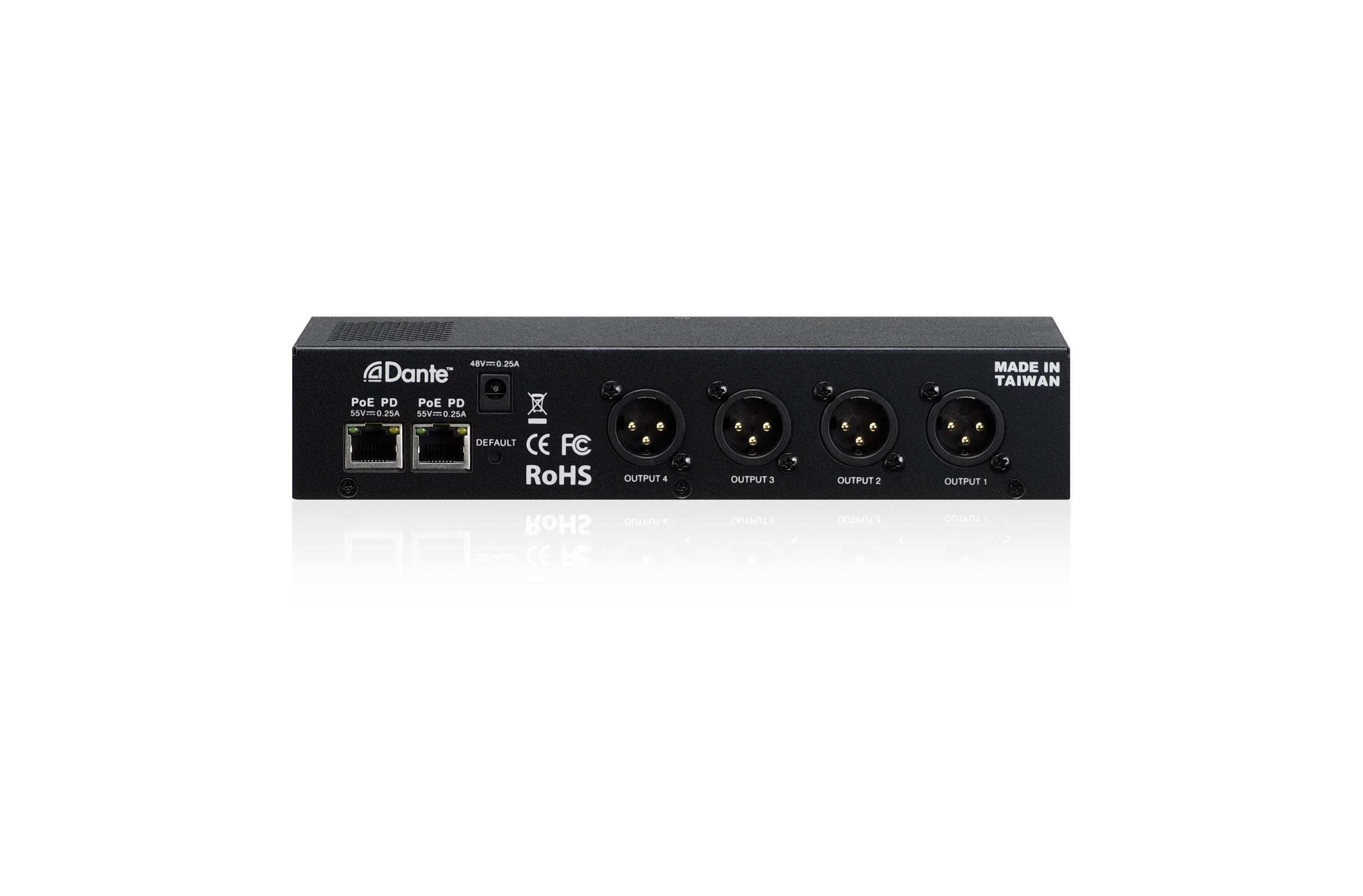 NBB-04T 音頻傳送器可以傳送轉換自其它 Dante 裝置注入到 Dante 網路串流的數個聲道的類比音頻。它的音頻輸出完全符合業界標準的 24dBu 輸出能力。